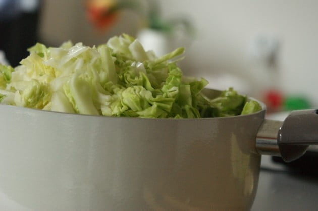 Kapustę obieram z wierzchnich liści, spłukuję wodą, wycinam głąb (zjadam!) i grubo siekam.
