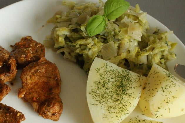 Klasyczna polska wersja mlodej kapusty zakwaszona jest smietana. Na koniec gotowania dodaje 2 lyzki smietany 18% wymieszanej z lyzka maki – kapusta staje sie kremowa i lagodna w smaku. Ta wersja jest moim ulubionym dodatkiem do kotletow schabowych.